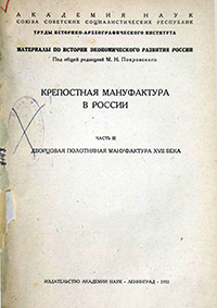 Крепостная мануфактура в России. Ч. 3: Дворцовая полотняная мануфактура XVII века / редактор: С. Г. Томсинский. - 1932. - XXXIV, 382 с., 3 л. ил., карта: табл. - (Труды Историко-археографического института / Акад. наук СССР; под общ. ред. М. Н. Покровского. Материалы по истории экономического развития России; [т. 5]). - Библиогр. / сост. М. И. Ахуном и В. А. Петровым: с. 302-306, также в тексте и в подстроч. примеч. - Указ. личных имен / сост. П. В. Акимовым: с. 313-359. - Указ. предметов / сост. А. С. Булгаковым: с. 360-379. - Хронол. указ. актов и табл.: с. 380-382.