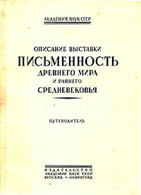 Описание выставки "Письменность древнего мира и раннего средневековья" [Текст]: Путеводитель / [Предисл.: Ю. Перепелкин]; Акад. наук СССР. Ин-т книги, документа, письма. - Москва; Ленинград: Изд-во Акад. Наук СССР, 1936 (Л.: тип. им. Евг. Соколовой). - Обл., 68 с., 1 вкл. л. ил.